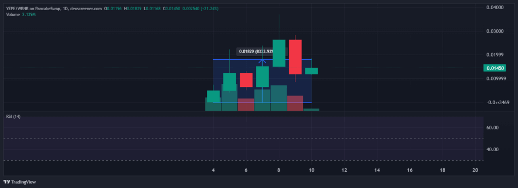 Yellow Pepe is a Pepe-like meme coin created on the BNB Chain. CoinMarketCap has not posted any chart for the project yet. However, its preview page has already been built. The trading chart on Dexscreener reveals that the meme coin has painted a widening rising channel following its launch. The price has been going up, but sellers are still in full force.