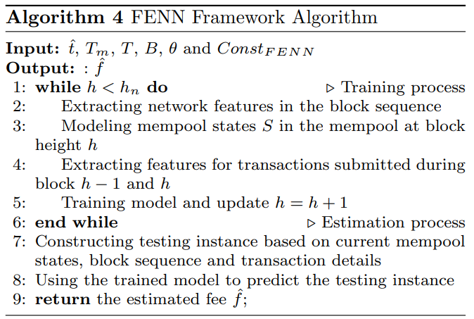\ After aggregating inputs from the feature extraction layer, FENN is followed by a fully-connected neural network. By learning the relationship among historical block information, mempool data, and transaction details, FENN can provide a specific estimated feerate for each transaction. The testing instance of the estimated transaction consists of three parts: the block sequence, current mempool states and the transaction itself.