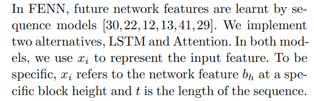 \ These three groups of features correspond to the three types of information fed to the estimation function F in Section 3. Although transaction features are already available in the submitted transaction, network features and mempool states are not known. However, such features are desirable, because if we had known how many transactions would be contained in future blocks, how fast future blocks would be generated, how competitive the submitted transaction would be in future mempools, we would increase the chance to predict the confirmation fee more accurately. Consequently, in FENN, our main idea is to predict network features and mempool states from historical state sequences by utilizing sequence learning models. Finally, we combine the three groups of features to do the estimation.