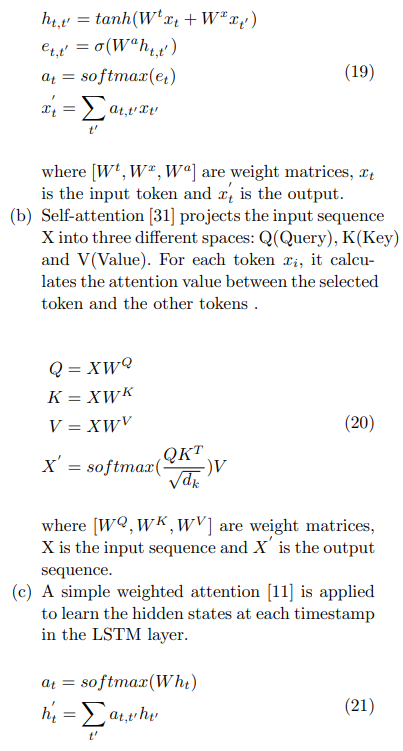 \ Approach 2: Attention is another popular timeseries processing technique. It simulates the cognitive process of selectively concentration on different parts in psychology. In other words, it returns a new representation vector related to the importance at various positions in the sequence. Three state-of-the-art attention modules are applied below: