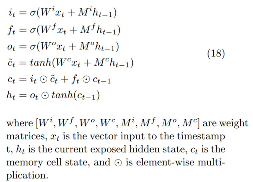 \ where W is a weight matric, and h is the hidden states in the former LSTM processing stage.
