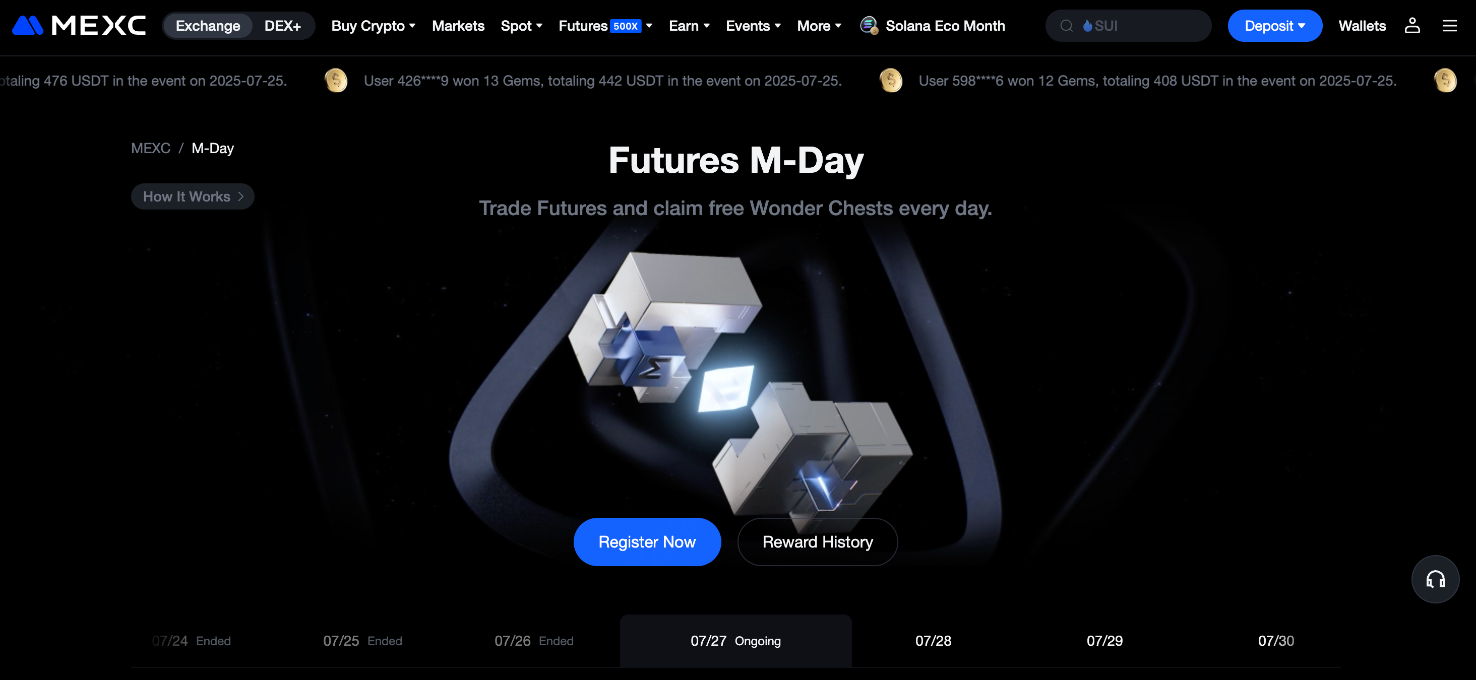 M-Day es un evento emblemático de Futuros MEXC donde los usuarios que operan con Futuros USDT-M o Coin-M pueden participar en un desafío para ganar Cofres Maravilla gratuitos, con la posibilidad de obtener recompensas en bonos de Futuros. Estos bonos pueden utilizarse como margen, y cualquier ganancia resultante puede retirarse.