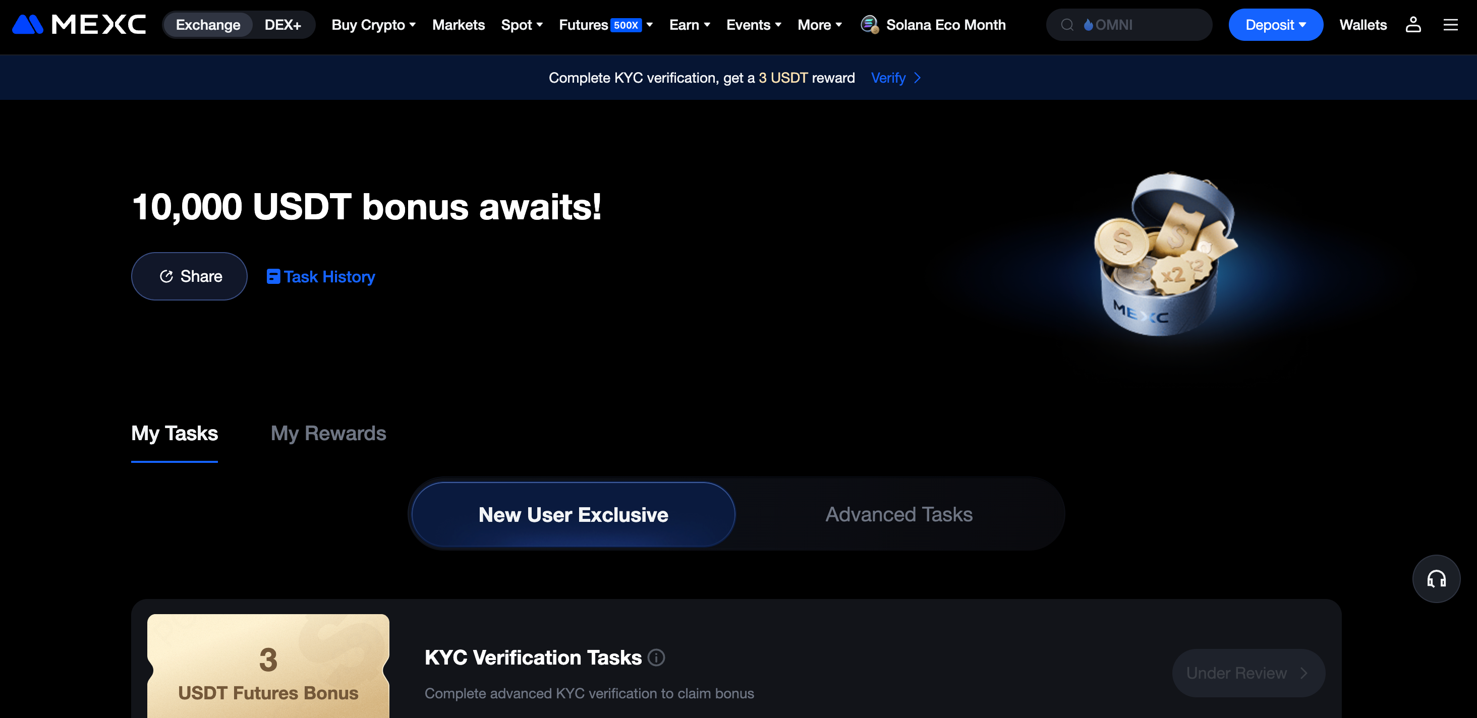 El evento de bono de Futuros Obtén $10,000 se divide en dos partes: Tareas Exclusivas para Nuevos Usuarios y Tareas Avanzadas. Las Tareas exclusivas para nuevos usuarios tienen un umbral de entrada bajo, lo que hace que las recompensas sean más fáciles de obtener, mientras que las Tareas avanzadas requieren completar un cierto volumen acumulado de trading antes de poder reclamar las recompensas.