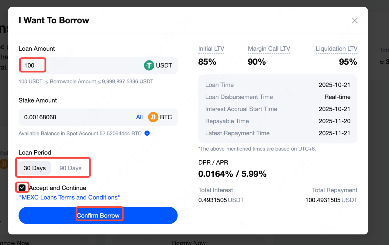 Ingresa el monto del préstamo deseado en USDT, y en la página se mostrará automáticamente la cantidad correspondiente de BTC que necesitas utilizar como garantía. Selecciona el periodo del préstamo, marca la casilla para aceptar los "Términos y Condiciones de Préstamos MEXC" y haz clic en Confirmar préstamo.