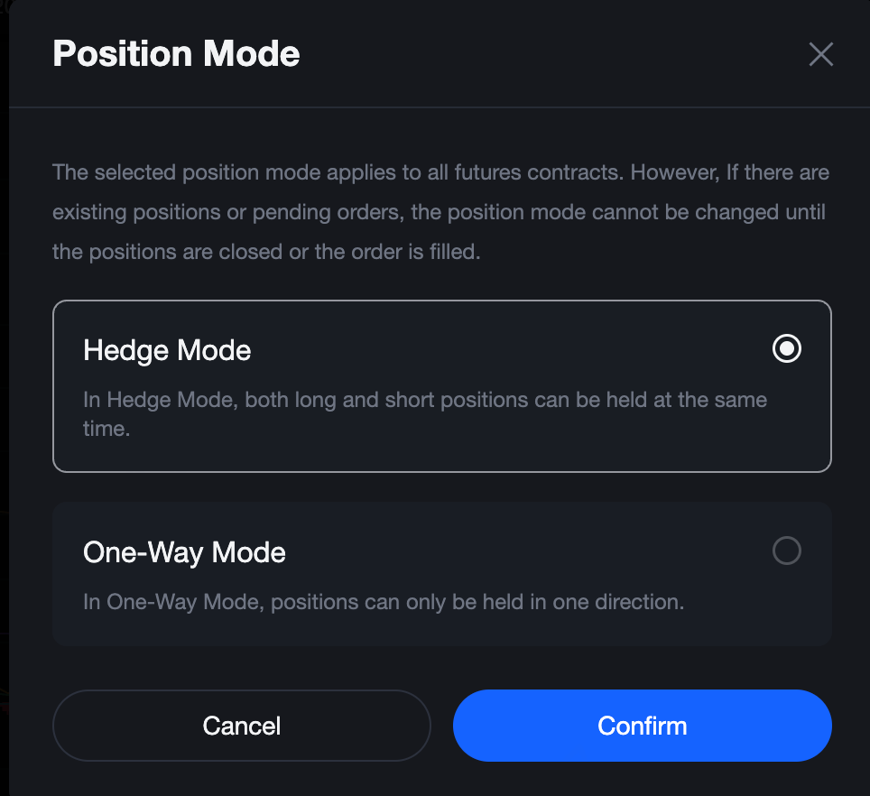 In the preferences, click on "Positioning Mode" under the trading settings, select "Two-way Position" or "Single Position", and click "OK" to complete the settings. Here we will use two-way position as an example to demonstrate.