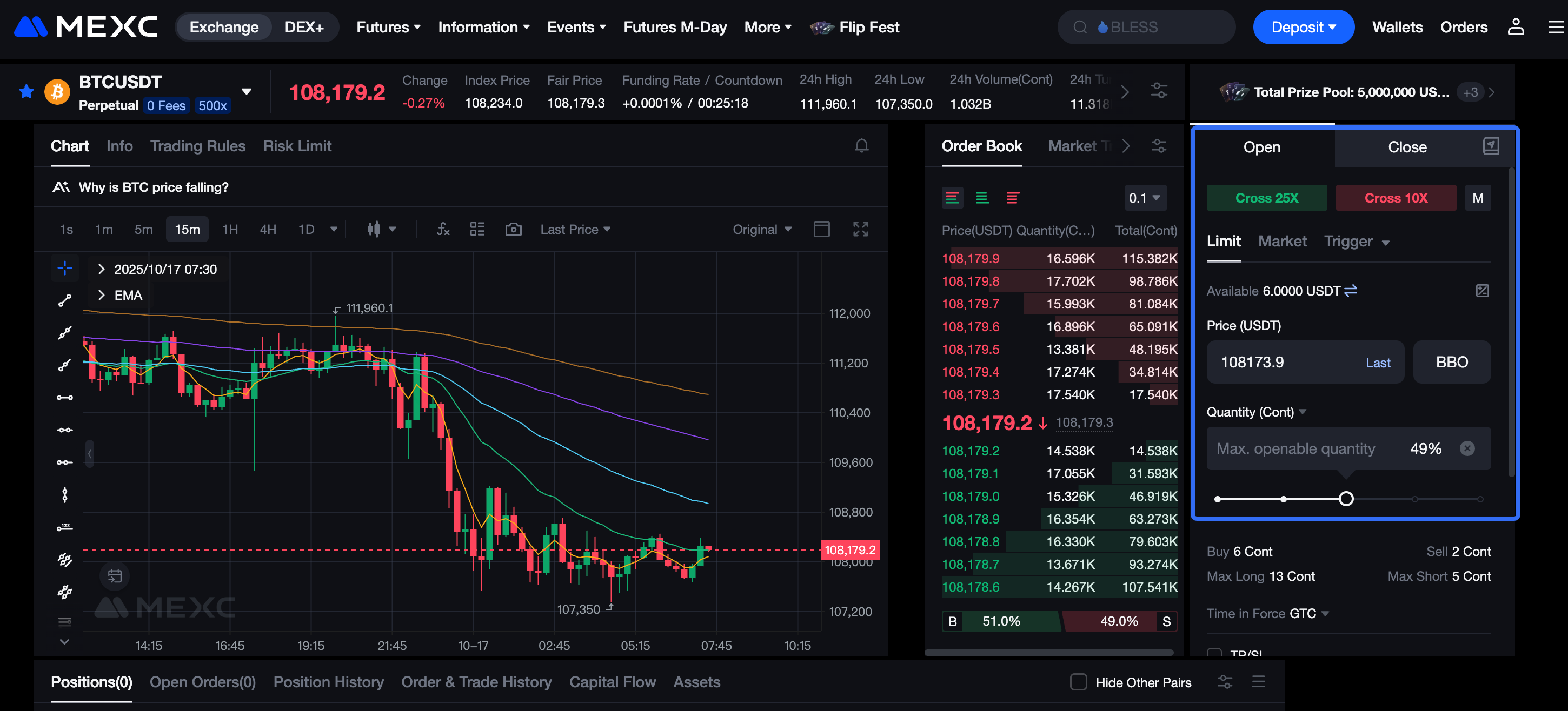 On the MEXC official website , select [USDT-based perpetual futures] under [Perpetual futures] in the top navigation bar [futures Trading] to enter the trading page, and switch to BTC/USDT perpetual futures trading pair on the trading page.