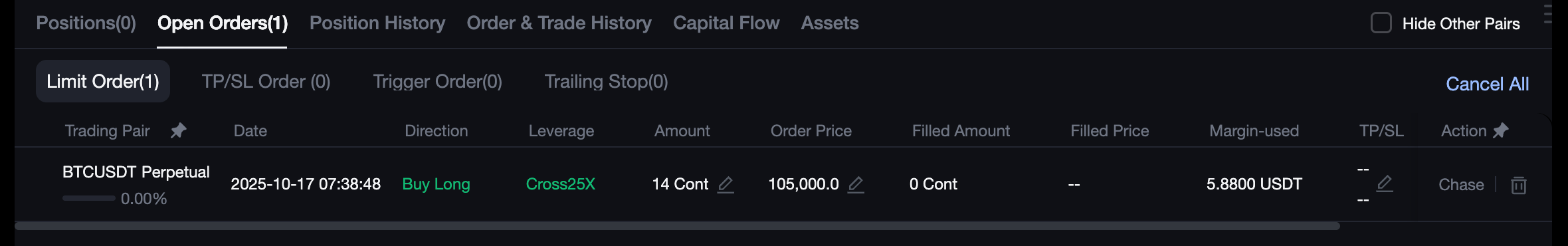 If your order is not triggered, you can check it in the "Current Order" section below, as shown in the figure below. If your order is triggered, you can check it in the "Current Positioning" section.