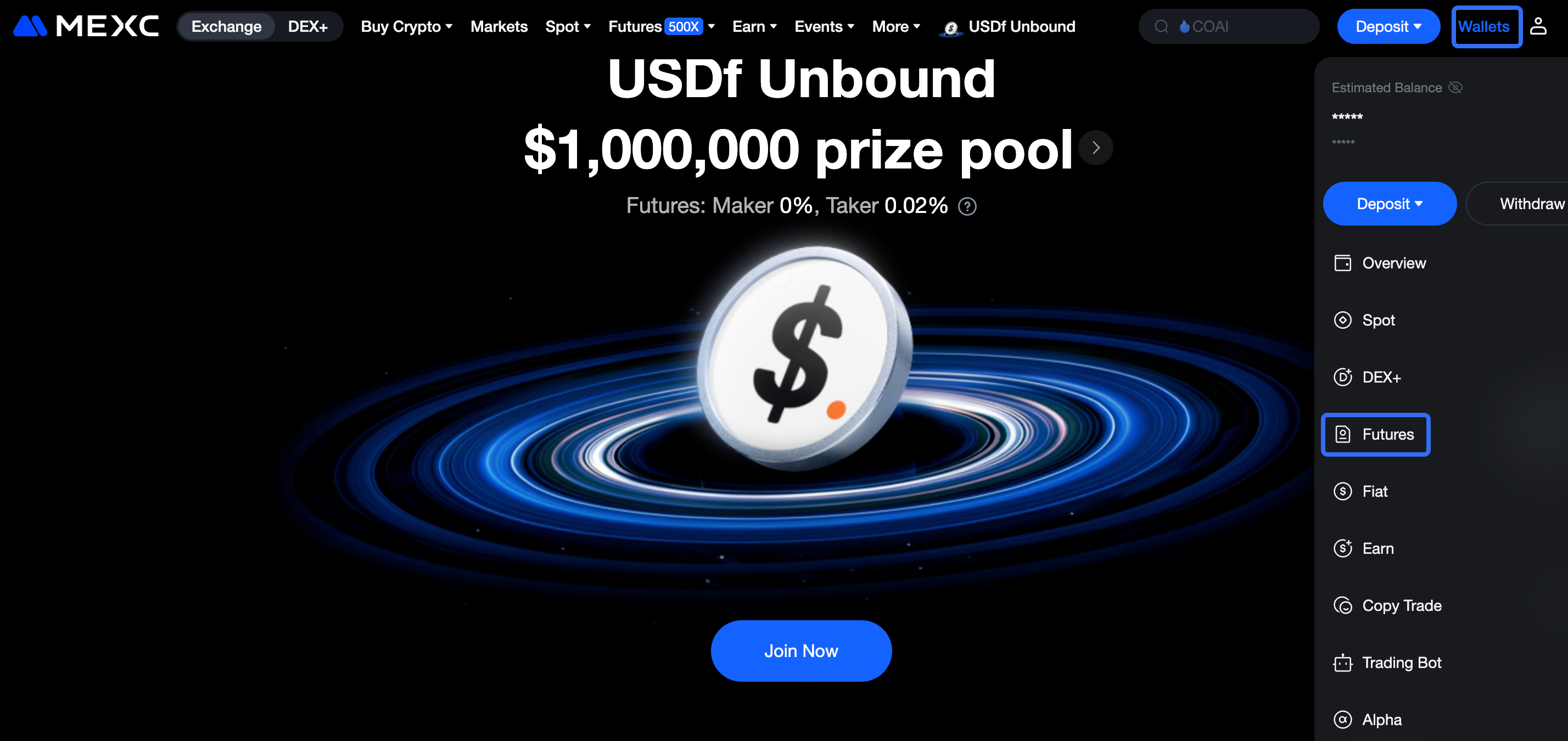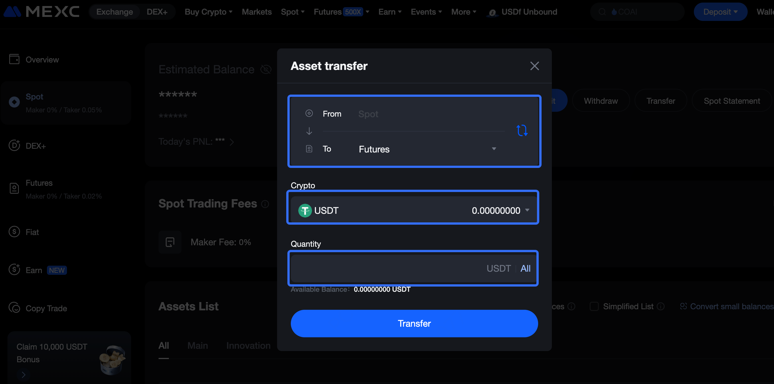 Open the MEXC official website and log in to your account. Click on "futures" in the upper right corner under "Wallets". Click the "Transfer" button on the right to transfer assets from the spot account to the futures account, select the USDT currency, enter the amount of USDT you want to transfer, and click "Transfer Now" after filling in.