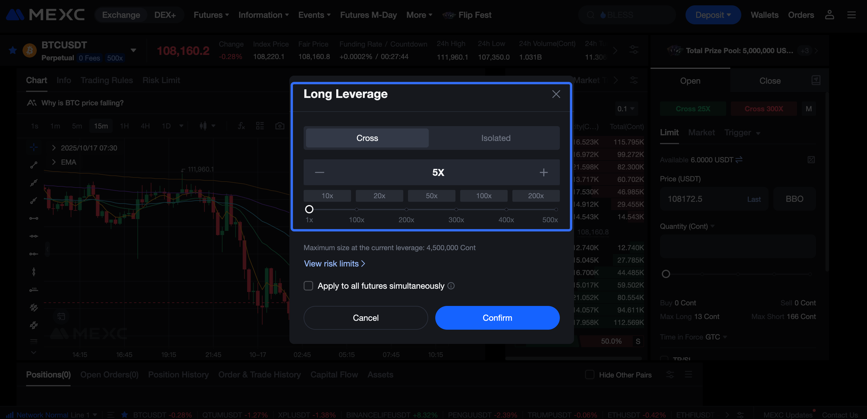 Click "cross" or "isolated" on the right side of the MEXC futures trading page to open the margin mode setting page, select the margin mode you want to set, and click "OK" to take effect. Here we will use cross as an example to demonstrate.