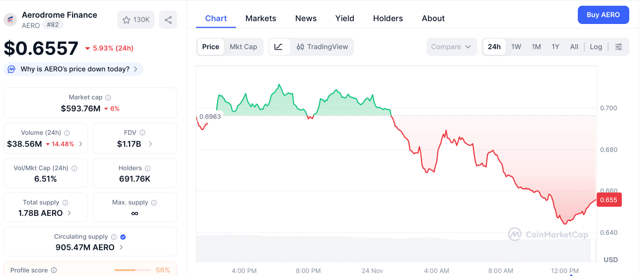 Amid the attack, the Aerodrome Finance (AERO) token dropped by 5.93% overnight, lagging behind the overall market.