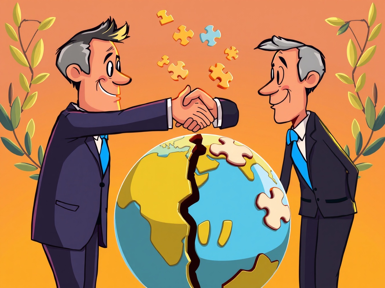 Hopeful cartoon illustration symbolizing an imminent Ukraine war resolution with diplomatic handshake.