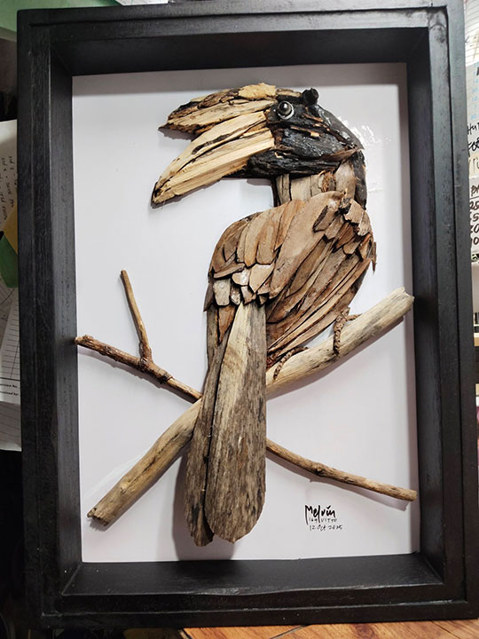 Melvin Upcycled Coastal Litter Handicrafts, founded by Melvin M. Vitto, collects discarded materials such as driftwood and dried leaves — much of it washed ashore during typhoons — and turns them into portraits and decorative pieces.