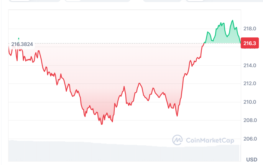 At the time of writing, AAVE is trading at $216.31, supported by a 24-hour trading volume of $607.89 million and a market capitalization of $3.33 billion. AAVE increased 0.21% over the last 24 hours. The modest increase highlights a cautious yet steady outlook for the asset amid ongoing changes in the global financial landscape.