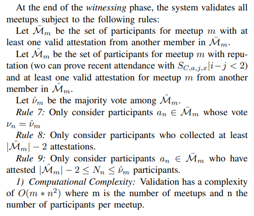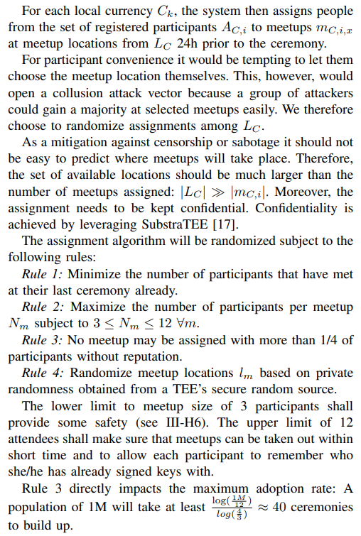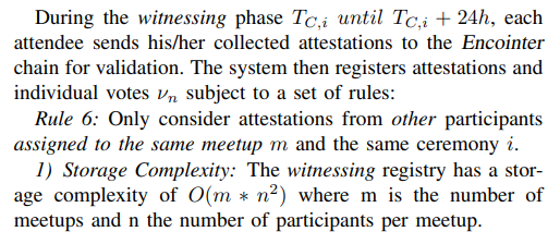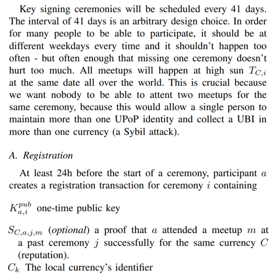 \ Attending one meetup supplies the individual with a simple proof-of-personhood (PoP). However, it doesn’t prove that one individual maintains exactly one PoP over time. The more subsequent ceremonies an individual attends, the more trustworthy is his/her Unique-PoP (UPoP) claim with respect to uniqueness.