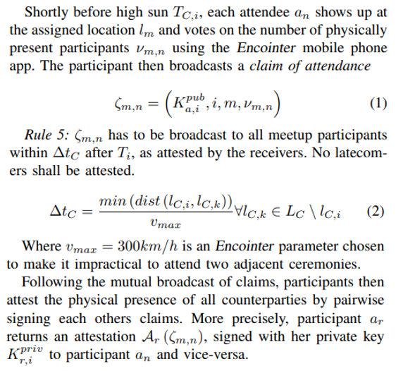 \ Hypothesis 1: The Encointer UPoP Protocol is secure if a majority of participants with reputation for each ceremony and each meetup is honest and successfully registers their nonempty attested claims to the blockchain in time.