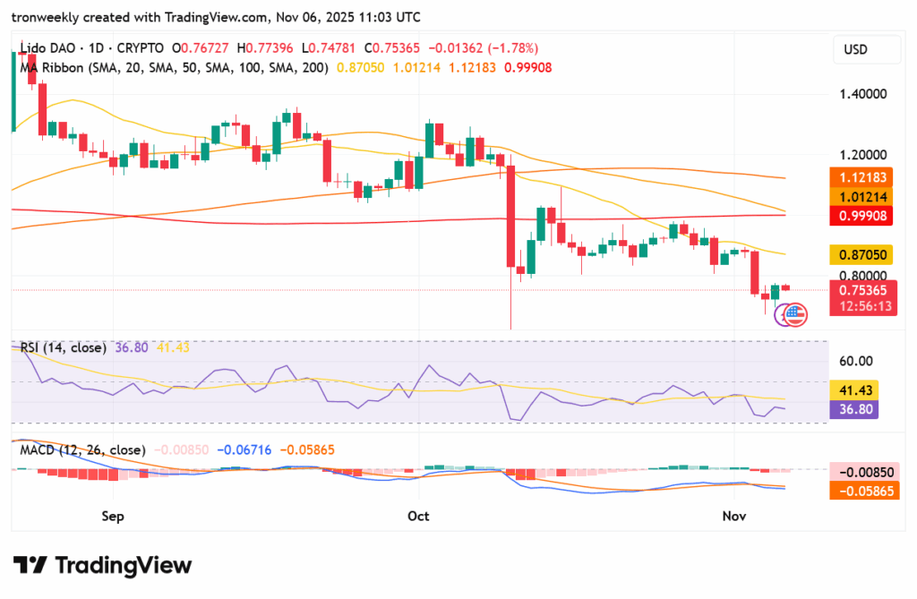 If buying gains strength, breaking through $0.80 may propel LDO towards $0.87 and possibly its target at $1.12. On the downside, levels of $0.74 and $0.70 remain significant support points that, if broken, could lead to more declines, and, on the other hand, a breakout above resistance may initiate the next recovery phase for Lido DAO.