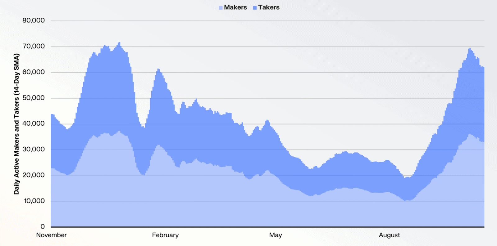 Ежедневное количество активных тейкеров и мейкеров на Polymarket. Данные: Keyrock.