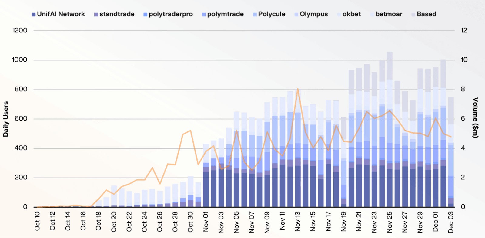 Ежедневное количество активных пользователей и объемы сделок партнерских сервисов Polymarket. Данные: Keyrock.