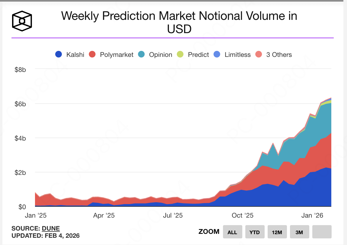 Sự quan tâm này là hợp lý khi bạn nhìn vào các con số. Thị trường dự đoán đã xử lý khoảng $12 tỷ khối lượng chỉ trong tháng 1, với Polymarket và Kalshi mỗi bên thanh toán hàng tỷ đô la. Jupiter đang tiếp cận như một công cụ tổng hợp, tích hợp Polymarket vào trong ứng dụng của mình giống như cách định tuyến hoán đổi token. Hyperliquid đang xây dựng nguyên bản, không đòn bẩy, không thanh lý và triển khai không cần cấp quyền cho các nhà xây dựng bên thứ ba.