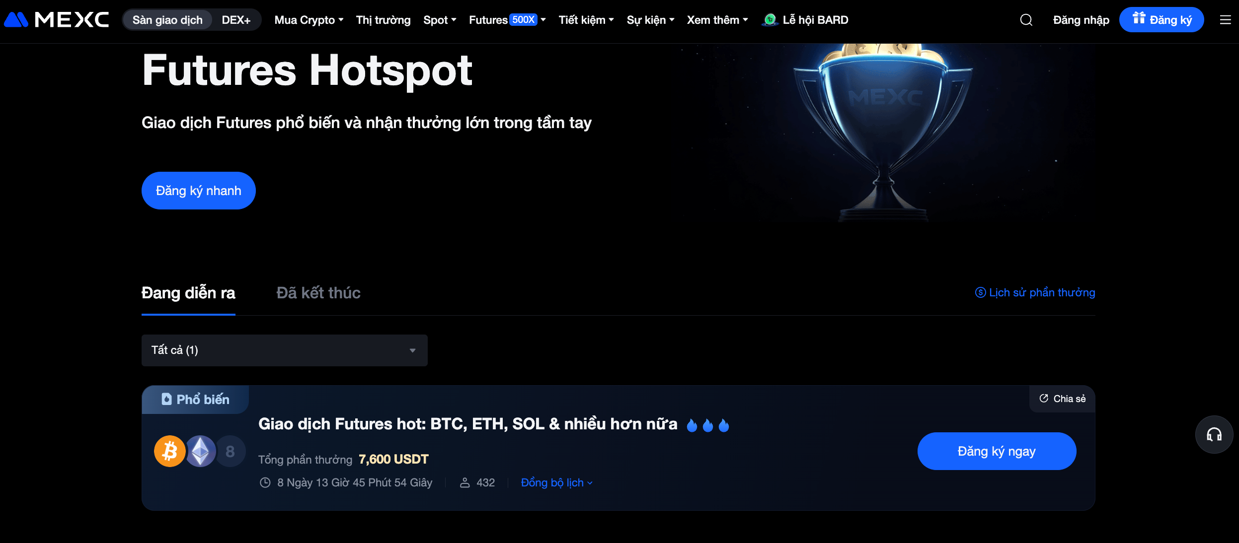 Futures Hotspot là sự kiện cho phép người dùng giao dịch các cặp Futures phổ biến. Bằng cách nhấn Đăng ký nhanh và giao dịch các cặp Futures được chỉ định trong thời gian sự kiện, người tham gia sẽ có cơ hội nhận tiền thưởng Futures.