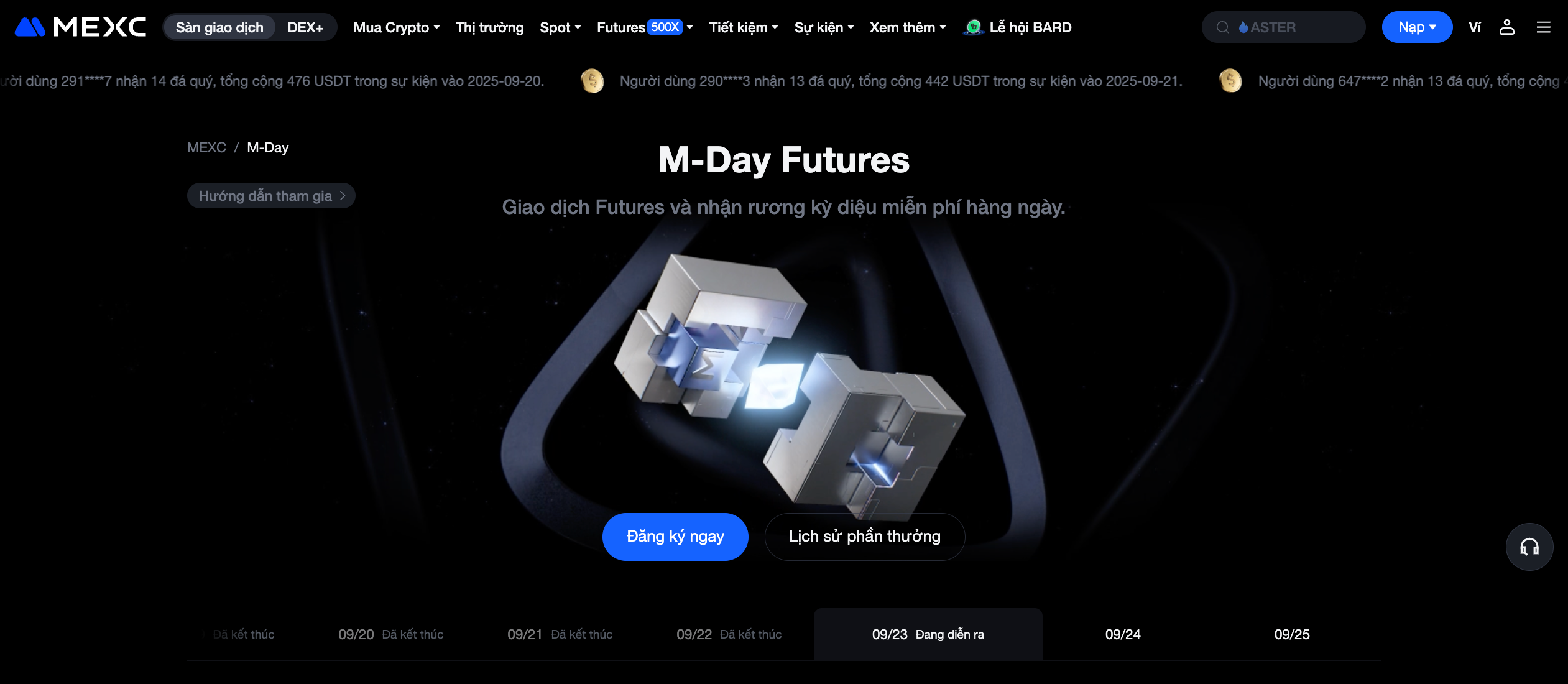M-Day là sự kiện đặc trưng của MEXC Futures, nơi người dùng giao dịch USDT-M hoặc Coin-M Futures có thể tham gia thử thách để nhận rương kỳ diệu miễn phí, với cơ hội nhận tiền thưởng Futures. Các khoản tiền thưởng này có thể được sử dụng làm ký quỹ và lợi nhuận tạo ra có thể rút.