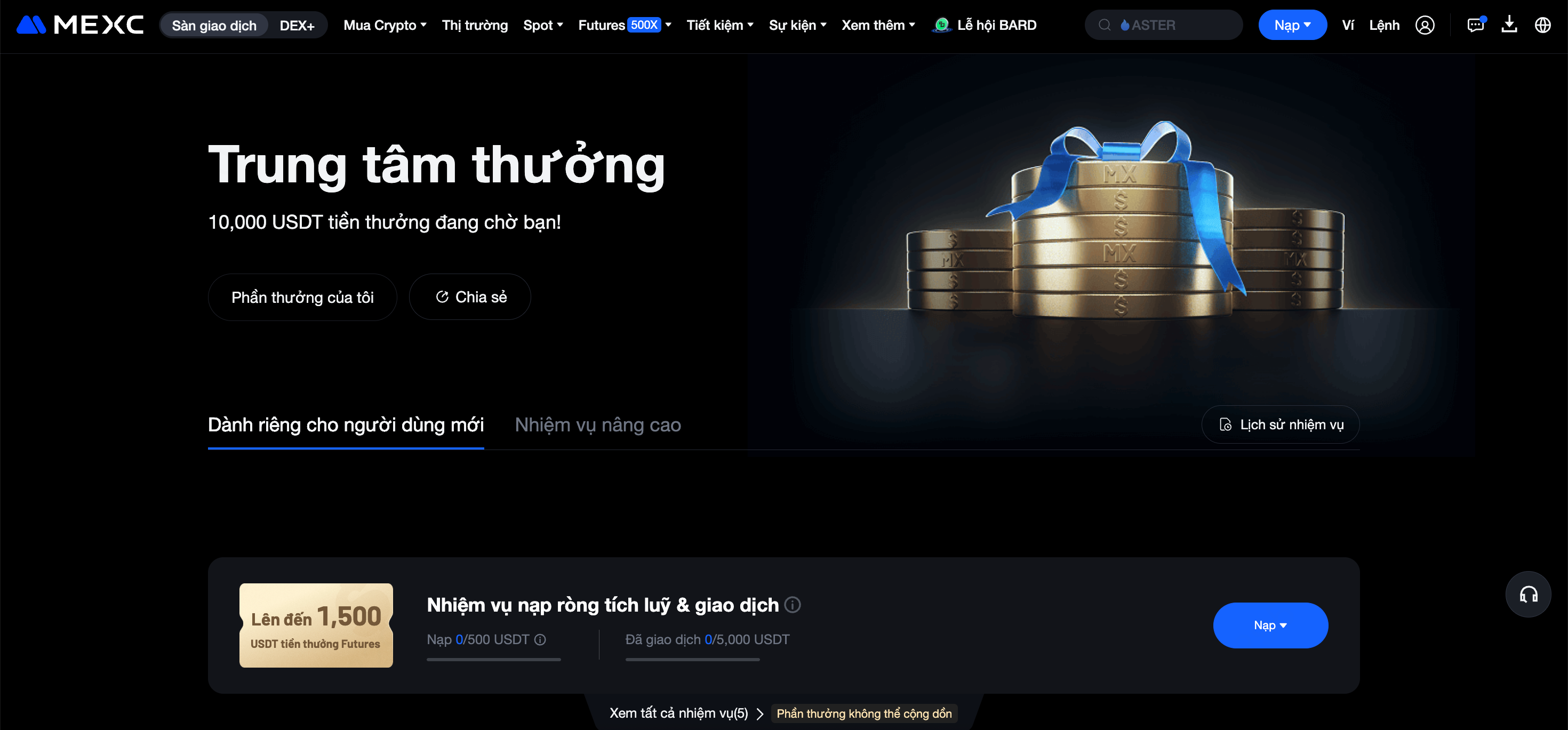 Sự kiện Nhận $10,000 tiền thưởng Futures được chia thành hai phần: Dành riêng cho người dùng mới và Nhiệm vụ nâng cao. Phần Dành riêng cho người dùng mới có yêu cầu tham gia thấp, giúp dễ dàng nhận phần thưởng hơn, trong khi các Nhiệm vụ nâng cao yêu cầu bạn phải tích luỹ khối lượng giao dịch nhất định trước khi có thể nhận phần thưởng.