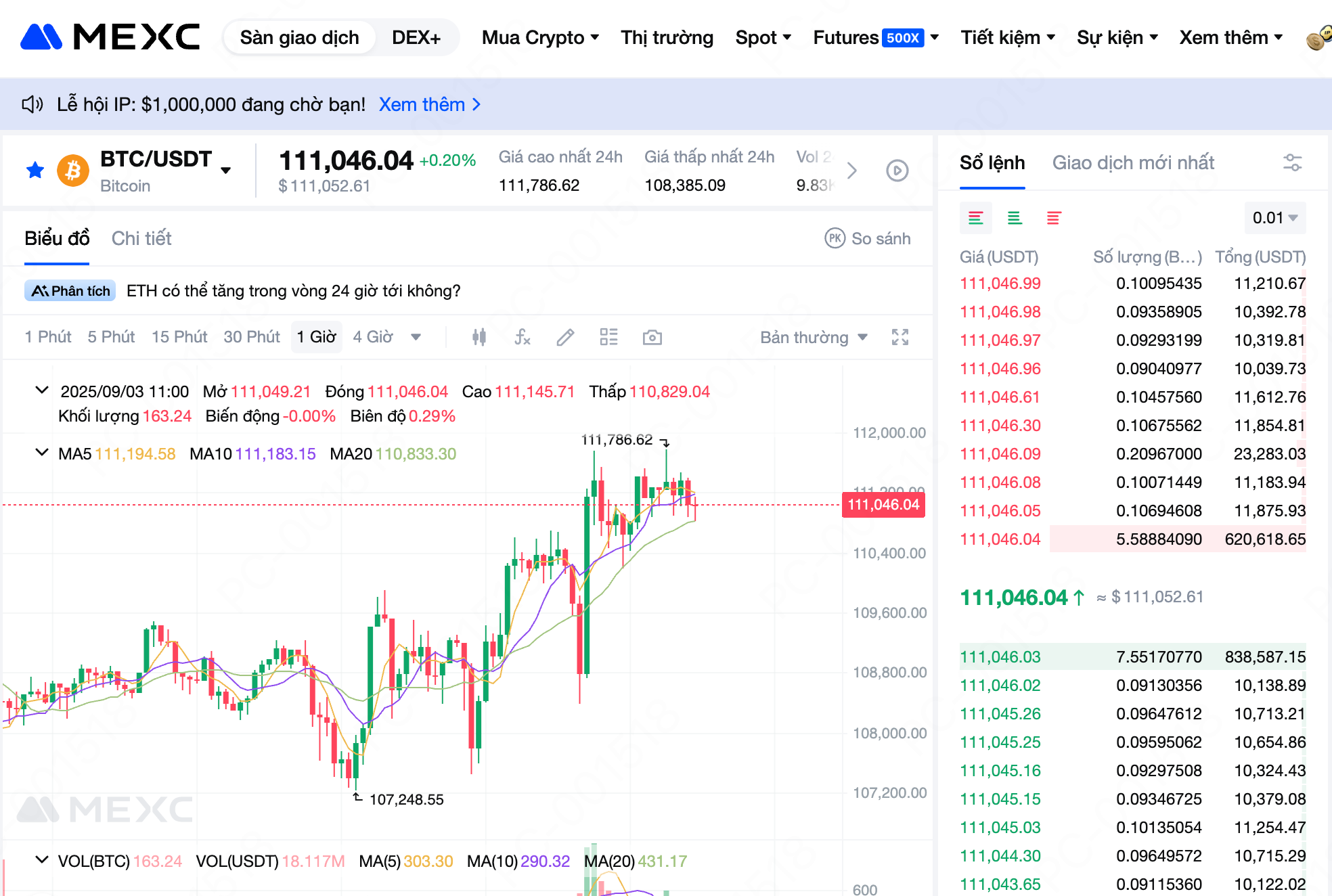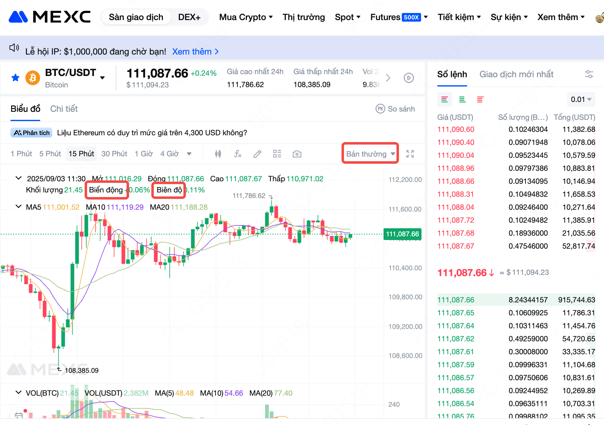 Biên độ = (Giá cao nhất – Giá thấp nhất) / Giá hiện tại = (113,253.68 – 112,925.44) / 113,137.63 = 0.2901%