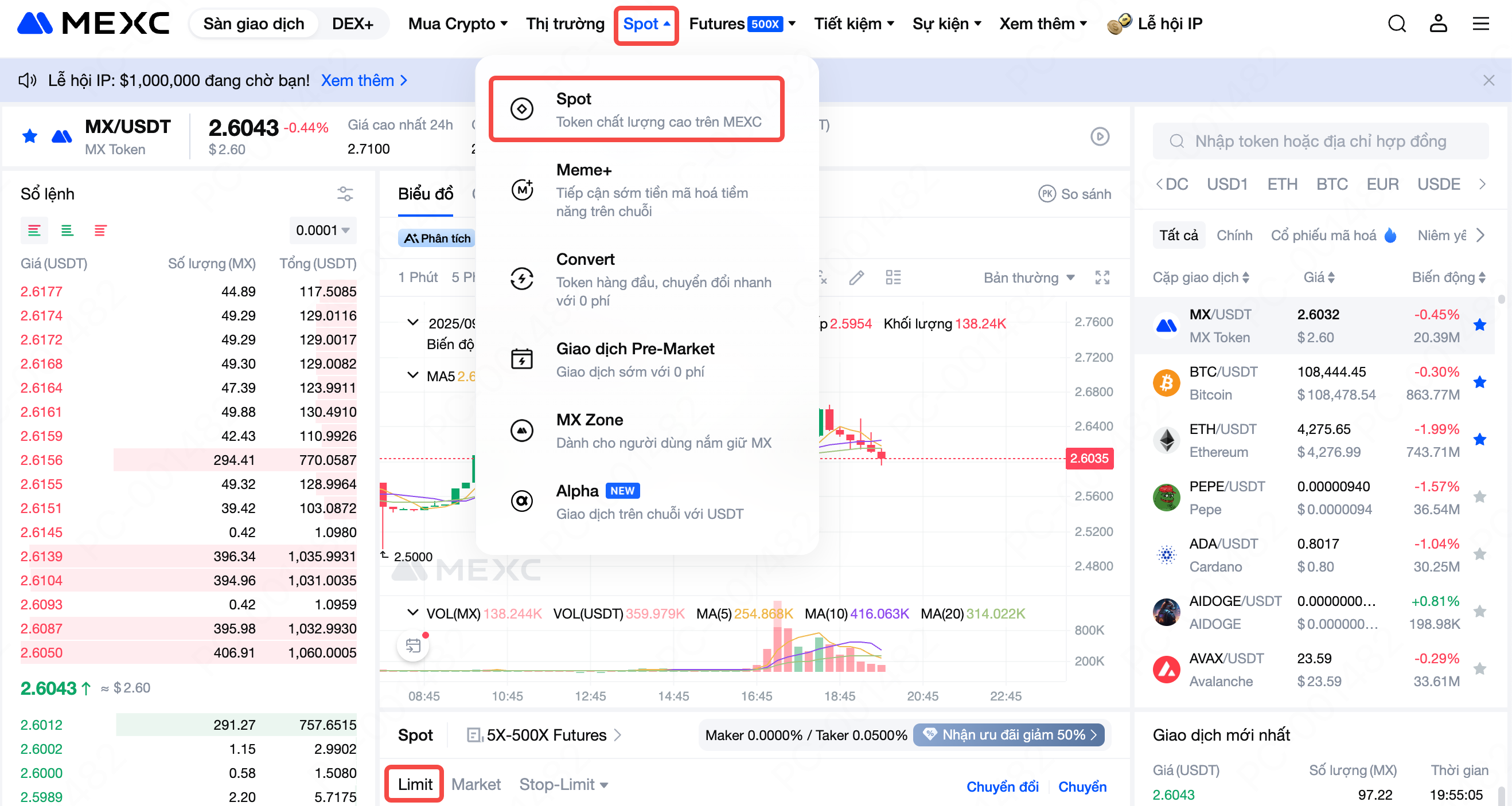 1) Truy cập trang web chính thức của MEXC, đăng nhập vào tài khoản và mở trang giao dịch Spot.