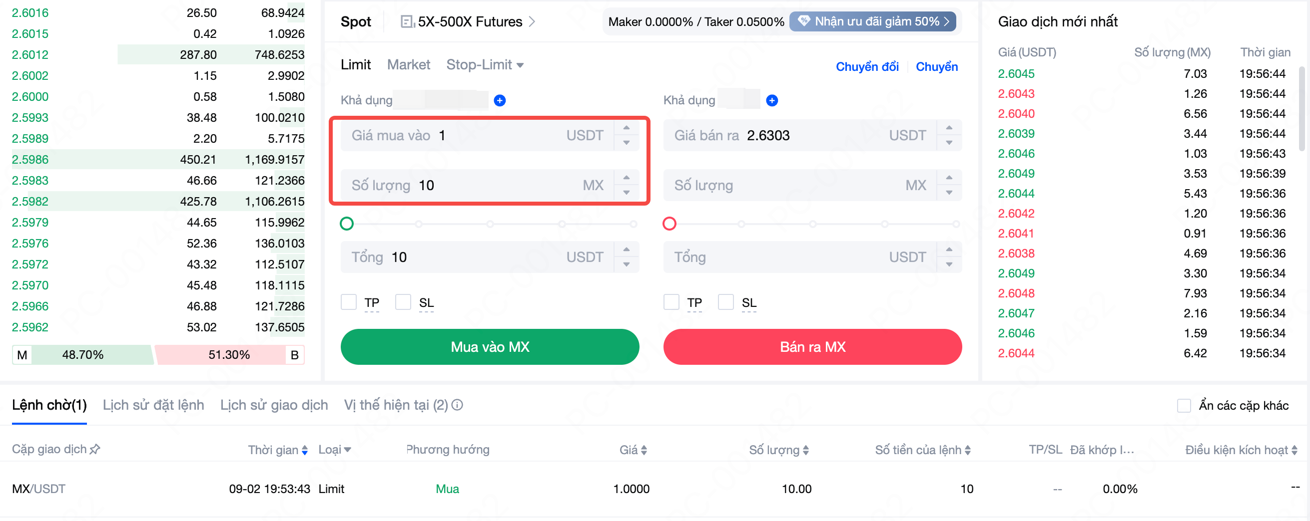 Lấy cặp giao dịch MX/USDT làm ví dụ.