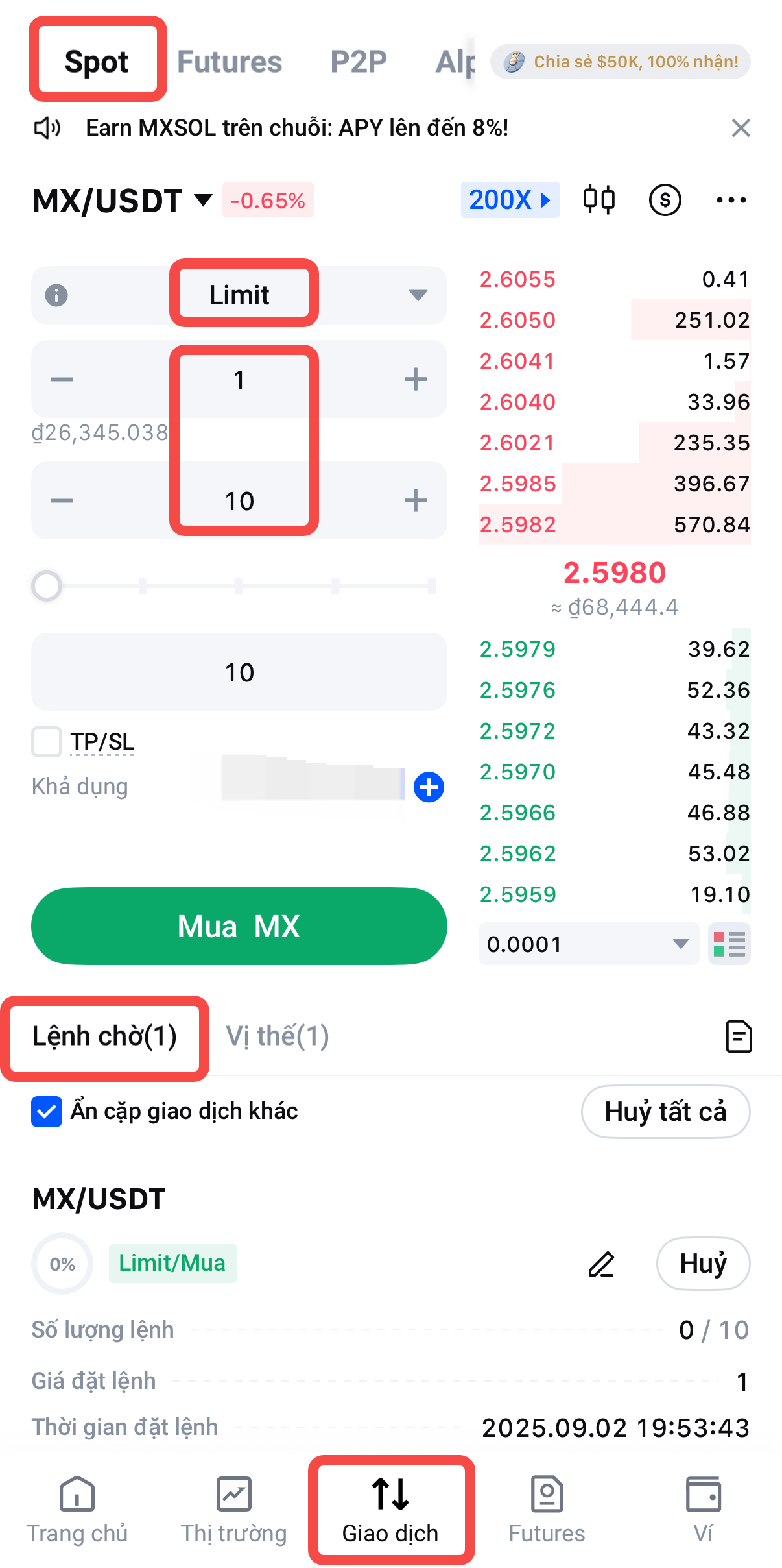 5) Nhấn Mua MX để đặt lệnh Limit.