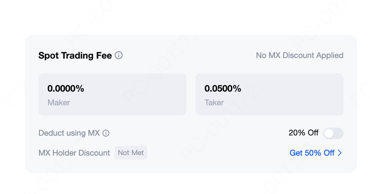 截至 2025 年 8 月 30 日, MEXC 上,現貨交易掛單(Maker)手續費率:0%,喫單(Taker)手續費率:0.05%。如果您持有 MX ,可抵扣合約手續費,享受 20%折扣如果持有超過 500 MX,還可以獲得 50%的折扣。