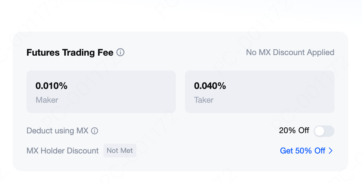 截至 2025 年 8 月 30 日,MEXC 永續合約交易掛單(Maker)手續費率:0.01%,喫單(Taker)手續費率:0.04%。如果您持有 MX ,將 MX 轉入合約帳戶後,可抵扣合約手續費,享受 20%折扣如果持有超過 500 MX,還可以獲得 50%的折扣。