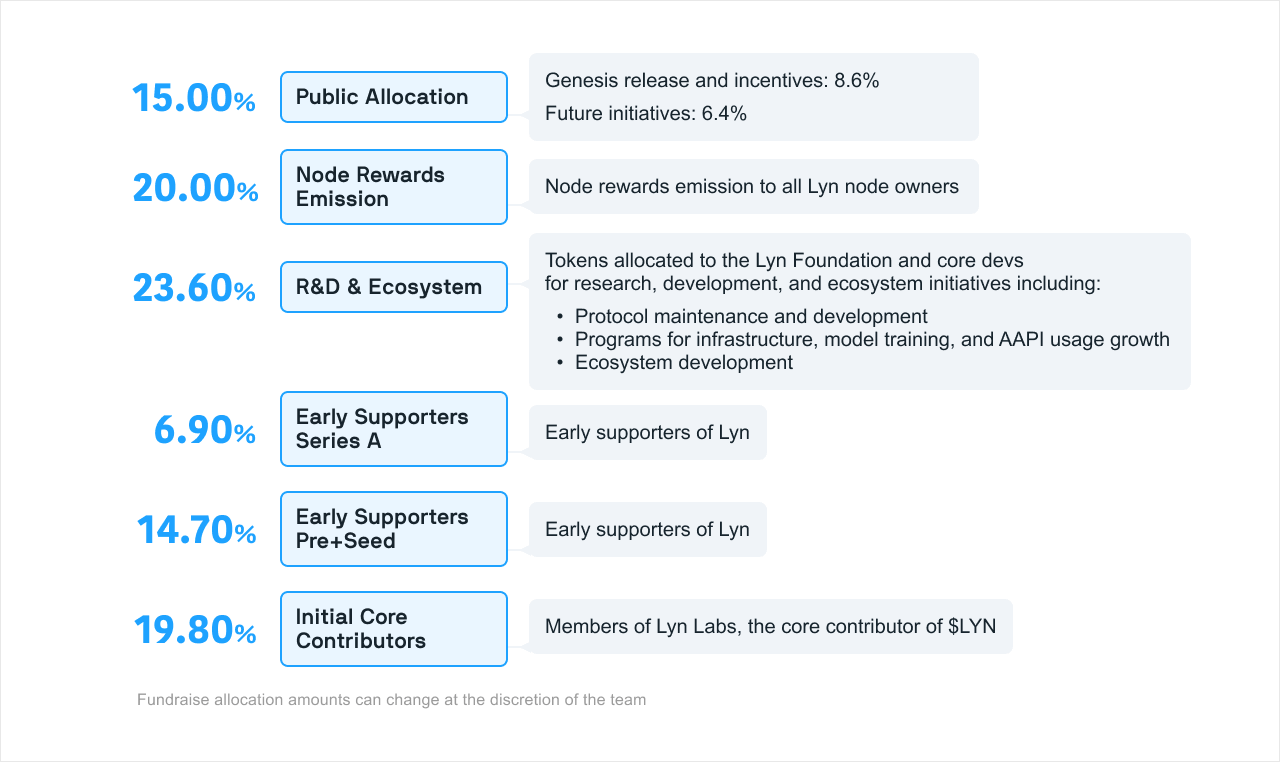 LYN 代幣在創世時具有 1,000,000,000 代幣的固定最大供應量,無額外鑄造。分配結構分為六個主要類別: