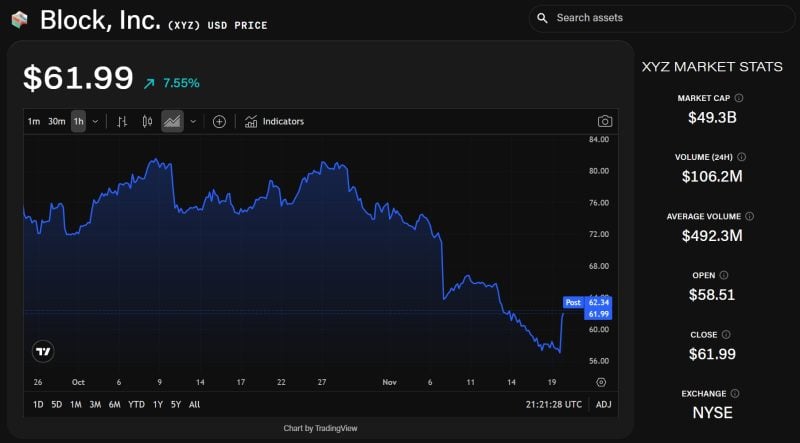 這一展望發布於 Block 最新業績公布兩週後,該業績顯示毛利增長強勁但再次未達到收入預期,並且在今日反彈前,股價經歷了三週的下滑,僅略高於 57 美元。