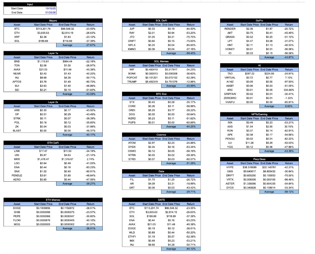 快轉到今天,所有被「加密包裝」的資產收益看起來都如出一轍。自 10 月 10 日閃崩以來,各板塊的下跌幅度幾乎無法區分。無論你持有的是什麼,或者該代幣如何捕獲經濟價值,亦或是該項目的發展軌跡如何……收益率大體上是一樣的。這非常令人沮喪。