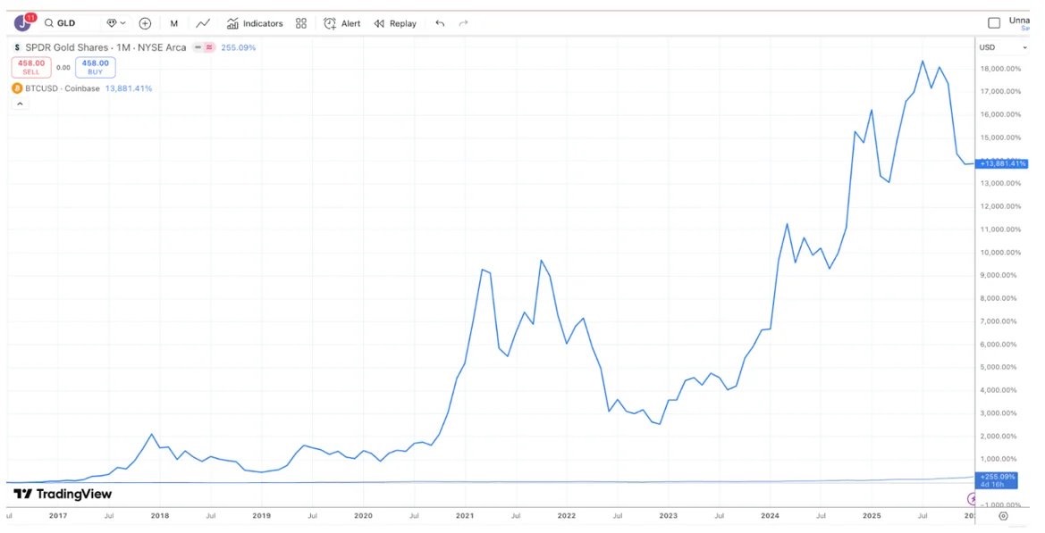 來源 TradingView,過去 10 年比特幣(BTC)與黃金(GLD)的收益對比