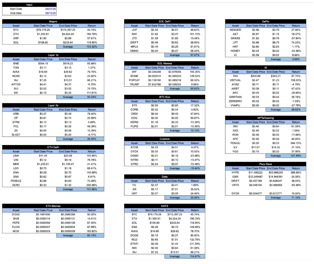 在市場繁榮時期,這張表看起來會稍微令人鼓舞一些。「好」代幣的表現往往優於「壞」代幣。但一個健康的系統其實應該相反:你希望好的代幣在糟糕的時期也能表現得更好,而不僅僅是在行情好的時候。以下是 4 月 7 日低點到 9 月 15 日高點的同一張表。