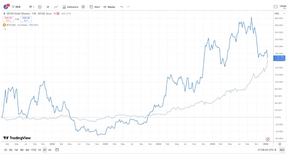 來源 TradingView,過去 5 年比特幣(BTC)與黃金(GLD)的收益對比