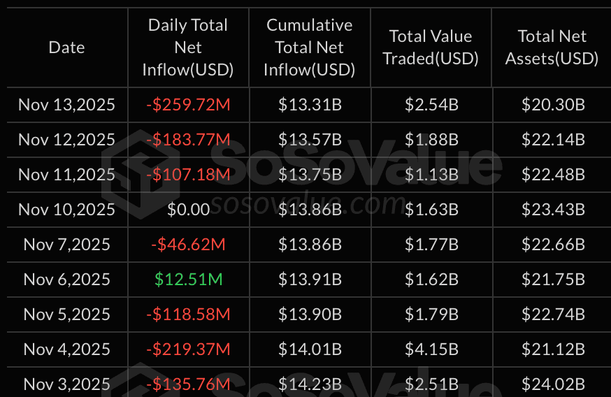 根據 SoSoValue 的數據,在 2025 年 11 月 13 日(UTC +8),現貨比特幣 ETF 行業損失了 $869.86 百萬。這是一個月內第六次出現負數。此外,資金撤出的金額是這些基金歷史上第二大的。據該平台稱,幾乎所有基金都出現了資金流出,其中三個基金損失超過 [...] 消息 現貨比特幣 ETF 記錄了單日近 $870M 的第二大資金流出 最初出現在 INCRYPTED。根據 SoSoValue 的數據,在 2025 年 11 月 13 日(UTC +8),現貨比特幣 ETF 行業損失了 $869.86 百萬。這是一個月內第六次出現負數。此外,資金撤出的金額是這些基金歷史上第二大的。據該平台稱,幾乎所有基金都出現了資金流出,其中三個基金損失超過 [...] 消息 現貨比特幣 ETF 記錄了單日近 $870M 的第二大資金流出 最初出現在 INCRYPTED。