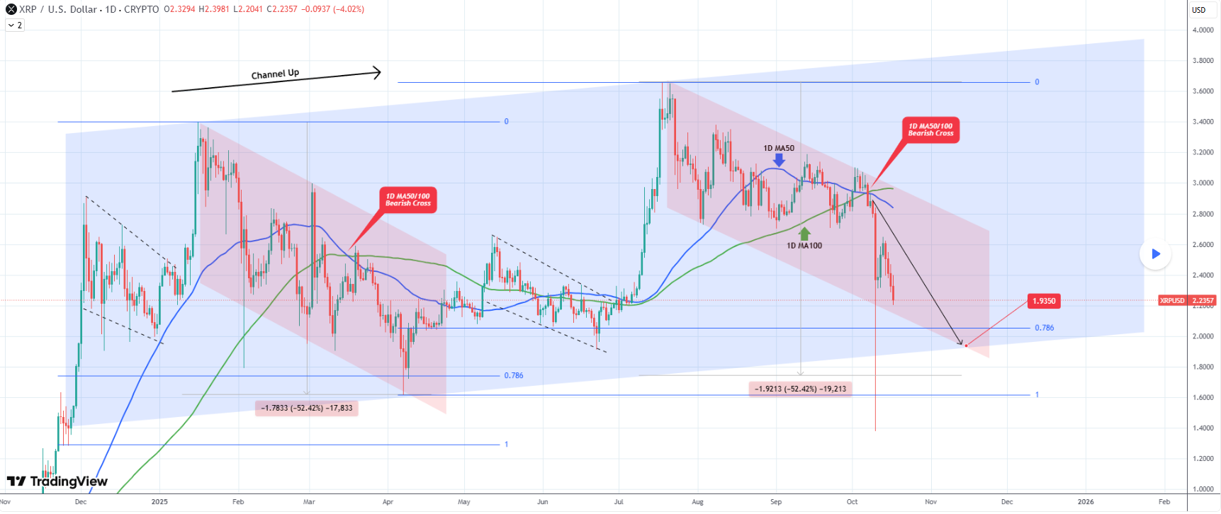最近的下滑與 50 天和 100 天移動平均線之間的看跌交叉吻合,這種形態歷來預示著 XRP 的大幅下跌。上次出現這種情況時,代幣跌破了 0.786 斐波那契回調水平,抹去了近一半的先前漲幅。